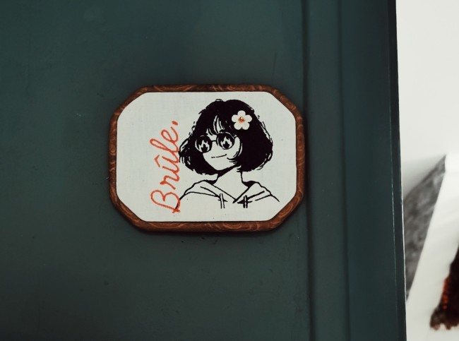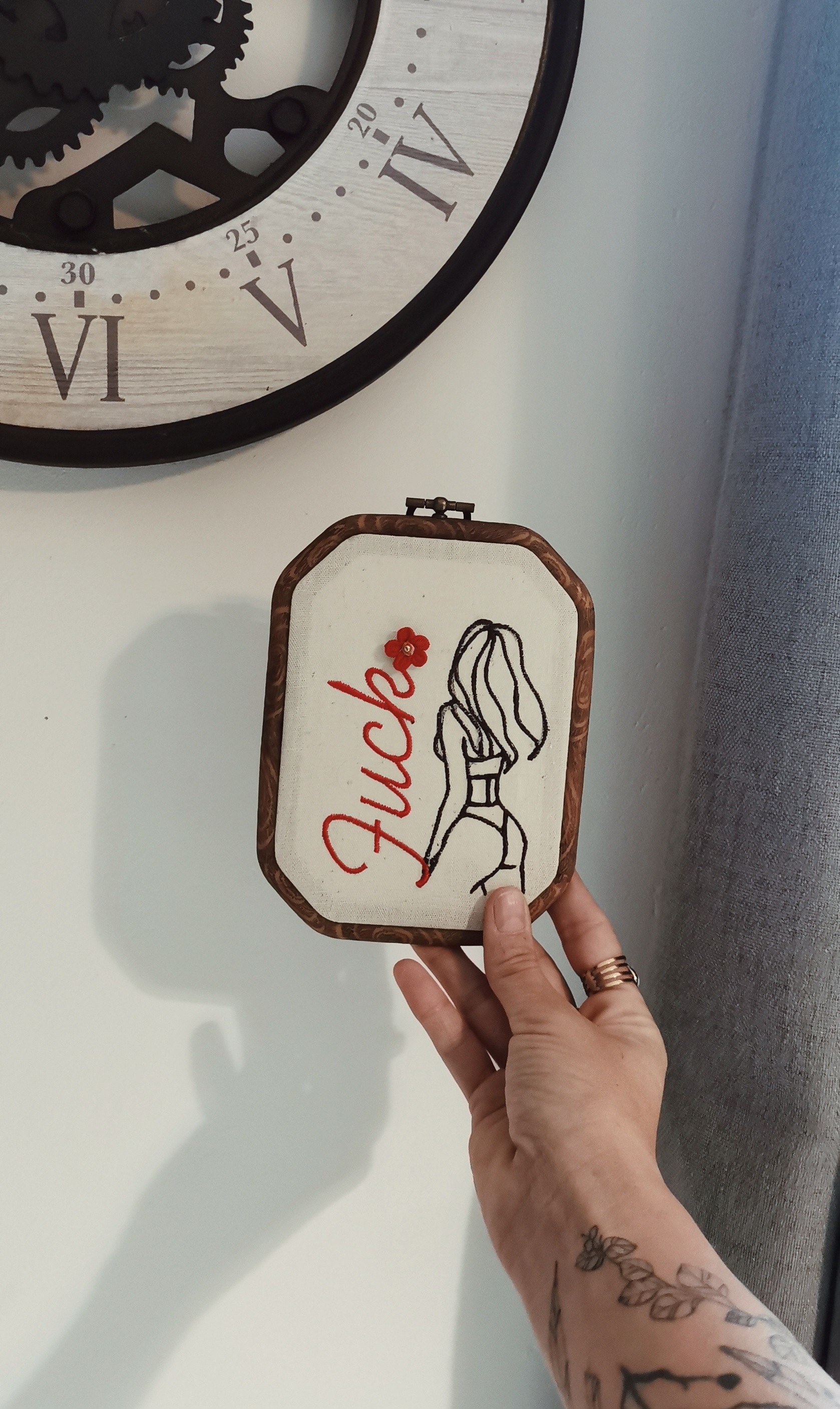 Sur un tissu écru recyclé, issu d’un vieux drap en coton et lin, s’esquisse une femme de dos en line art. Sur le côté, une inscription douce — fuck — accompagnée d’une fleur brodée, symbolise la dualité entre tendresse et rébellion.