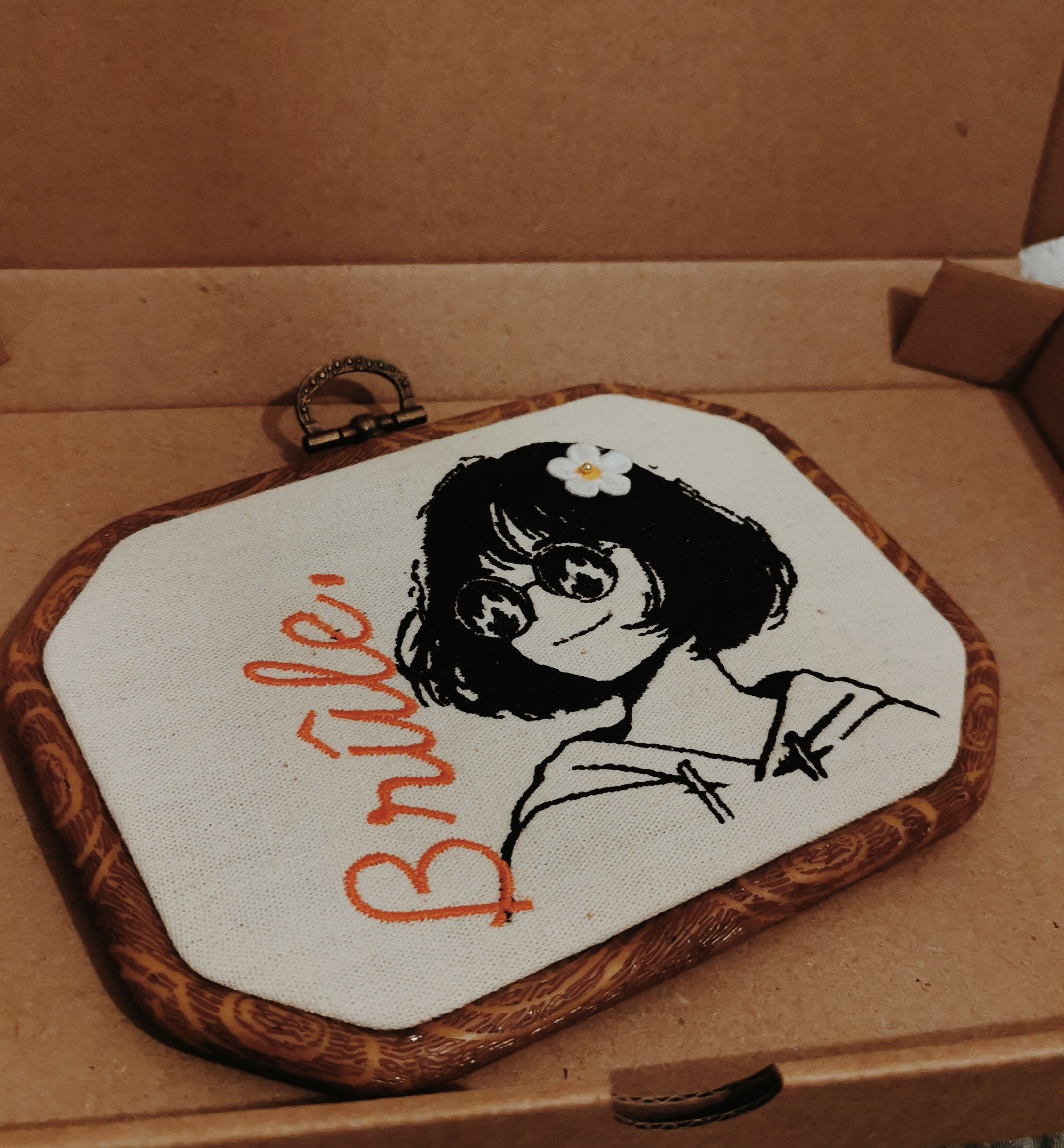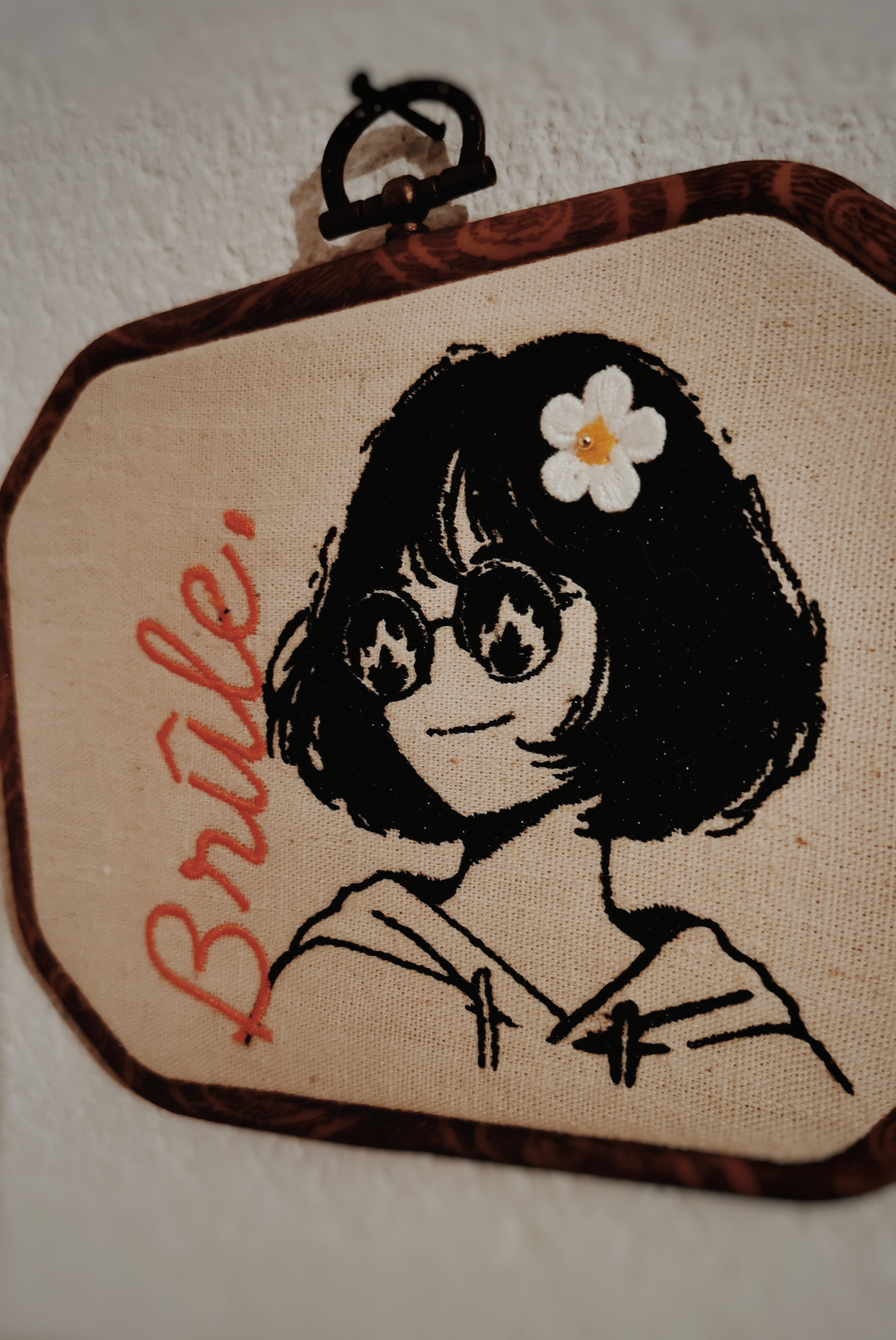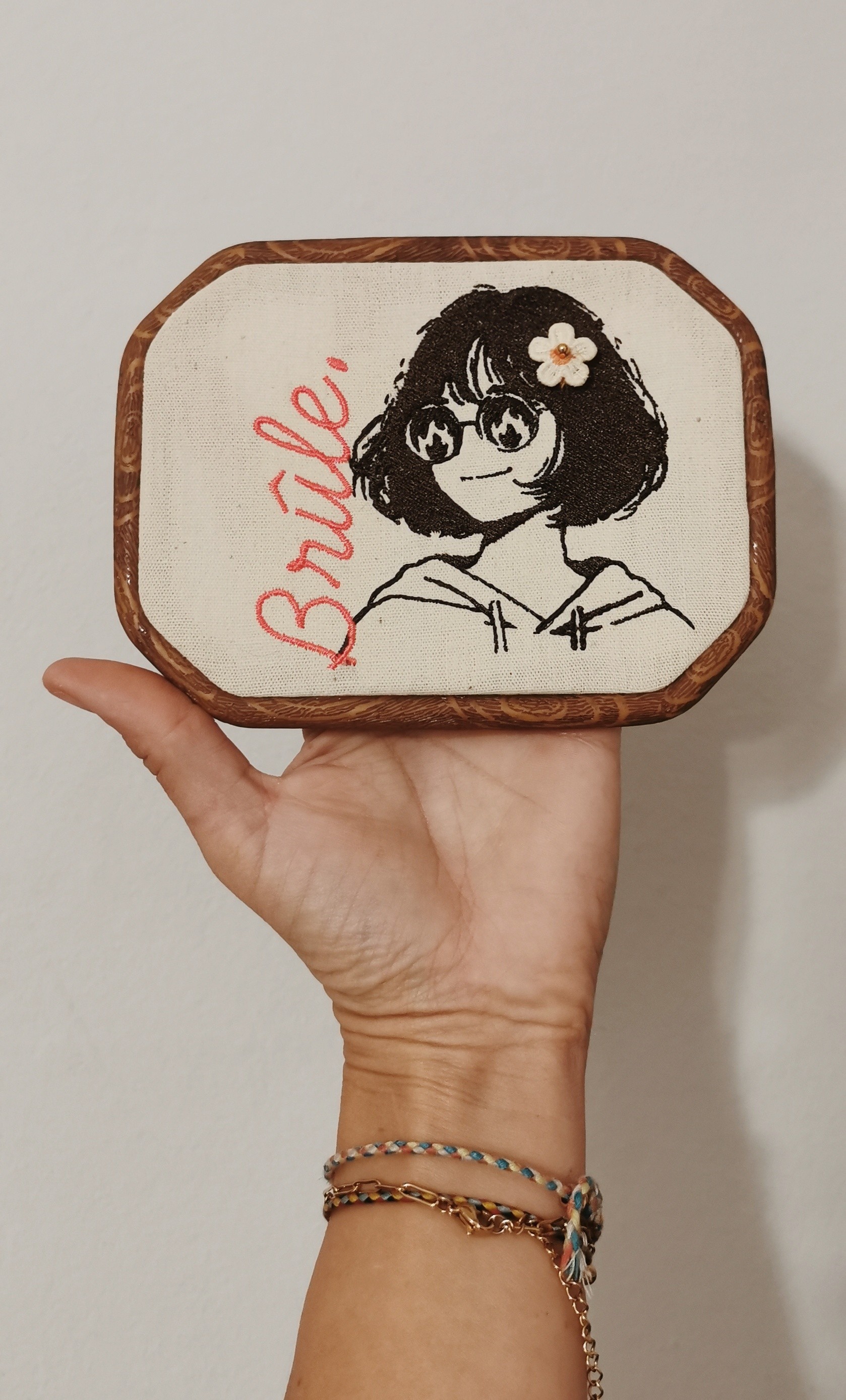 Sur un tissu écru recyclé, issu d’un vieux drap en coton et lin, s’esquisse une jeune femme aux lunettes de soleil enflammée. Sur le côté, une inscription douce — Brûle . — accompagnée d’une fleur brodée, symbolise la dualité entre tendresse et rébellion.