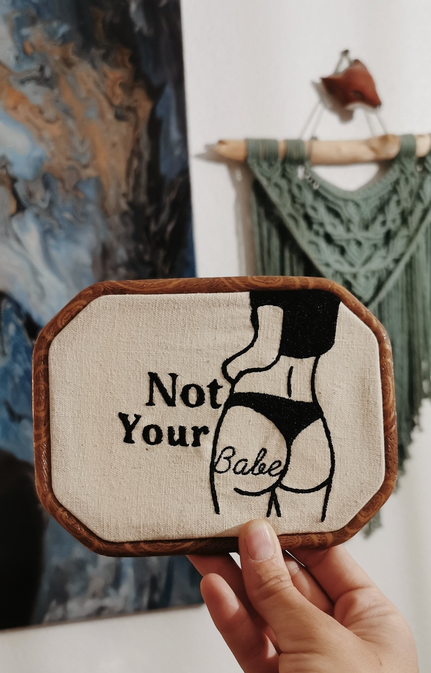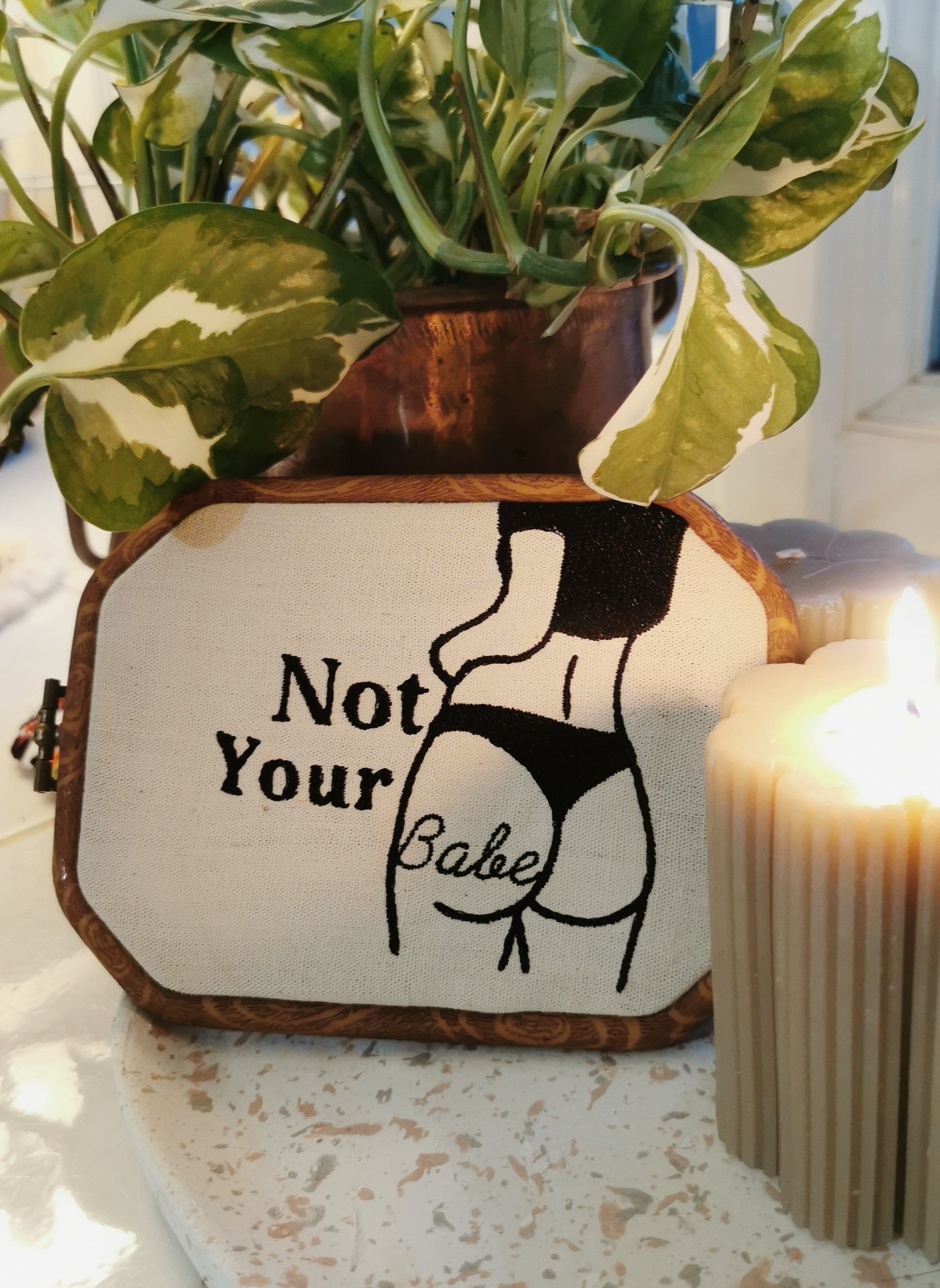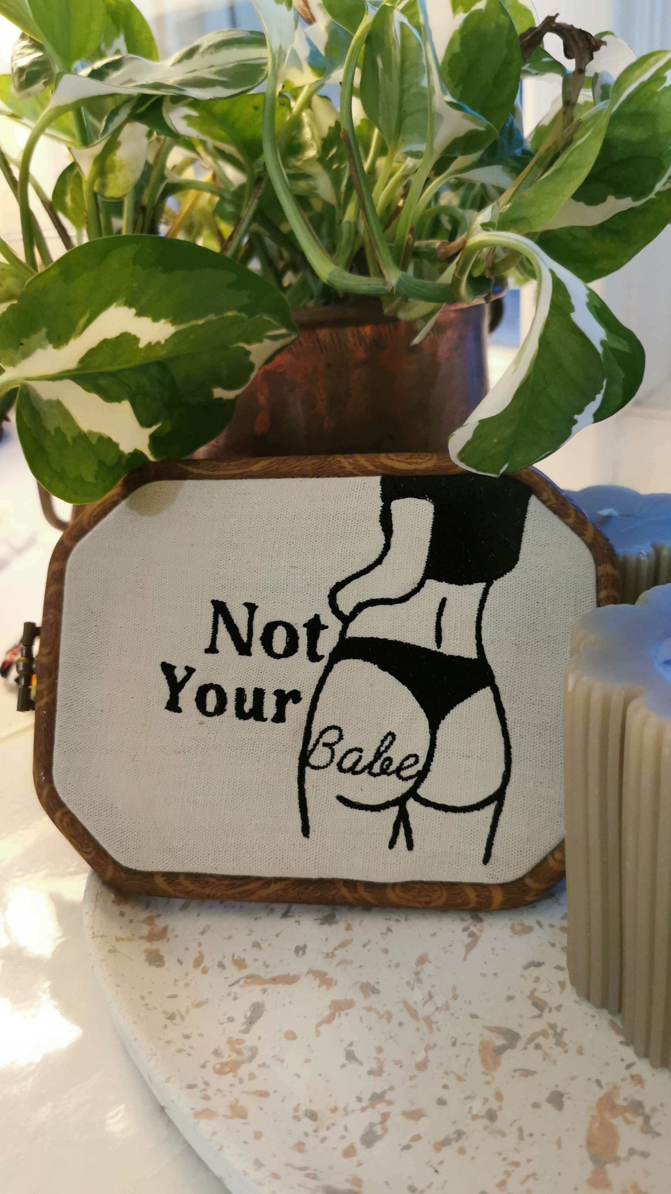 Avec Vera la série foutue liberté prend des courbes assumées. Une broderie minimaliste "NOT YOUR BABE" parce que le corps d'une femme n'a pas besoin d'être validé, ni approuvé.