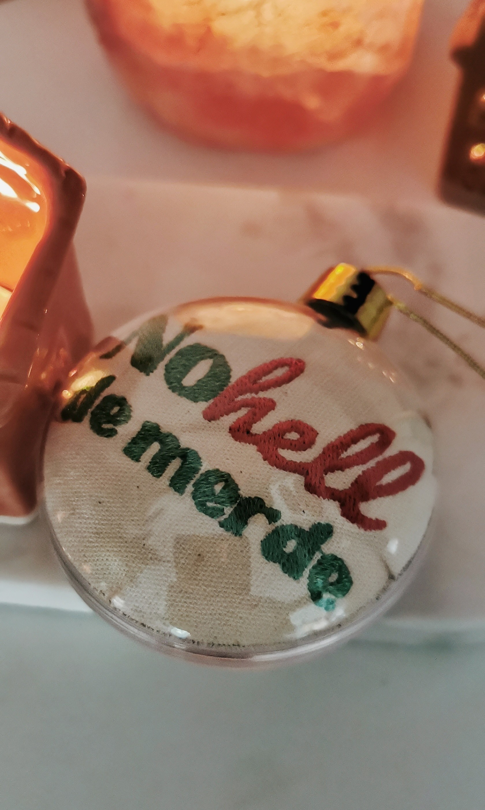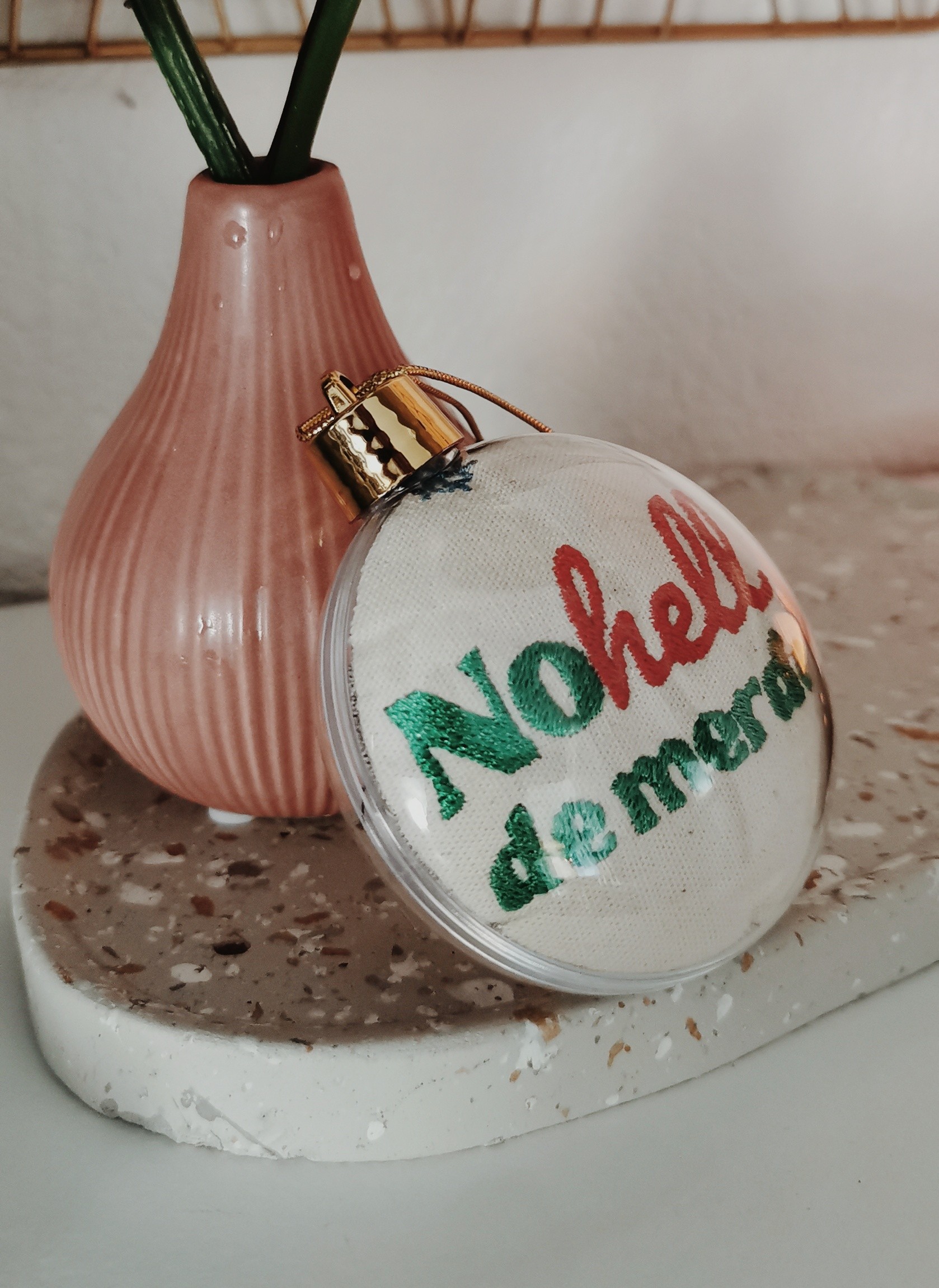 la boule “Nohell de merde”, réalisée à la main, renferme une petite broderie rouge et verte sur tissu écru recyclé.