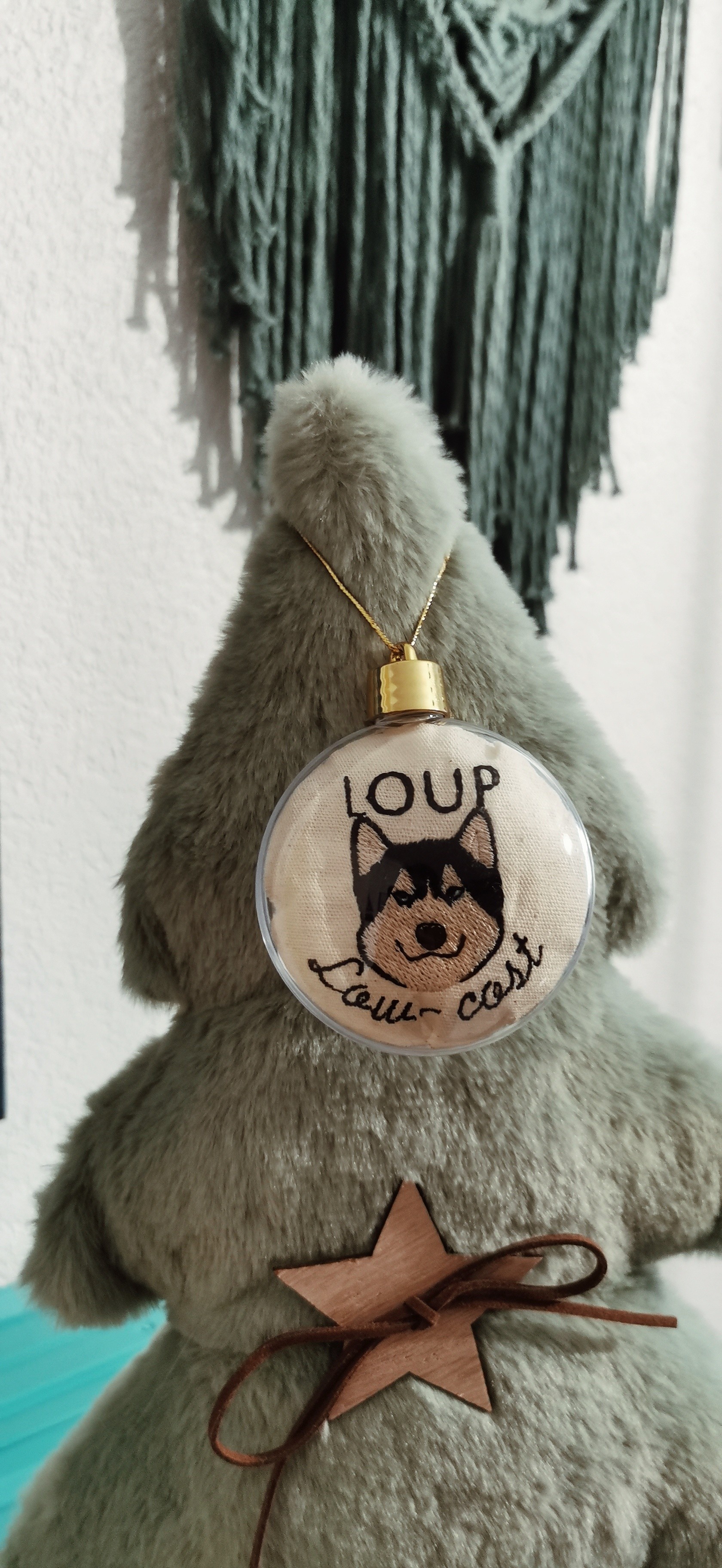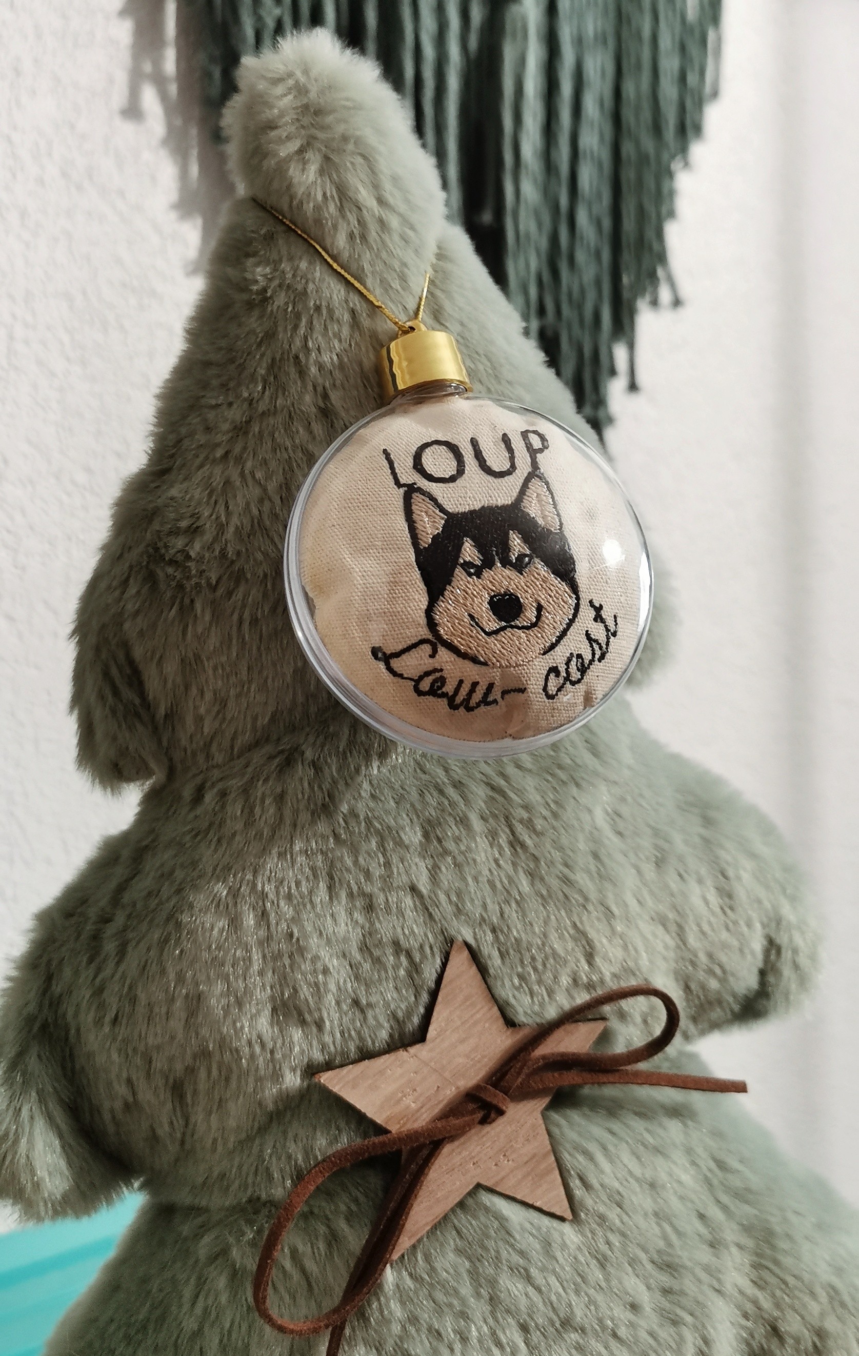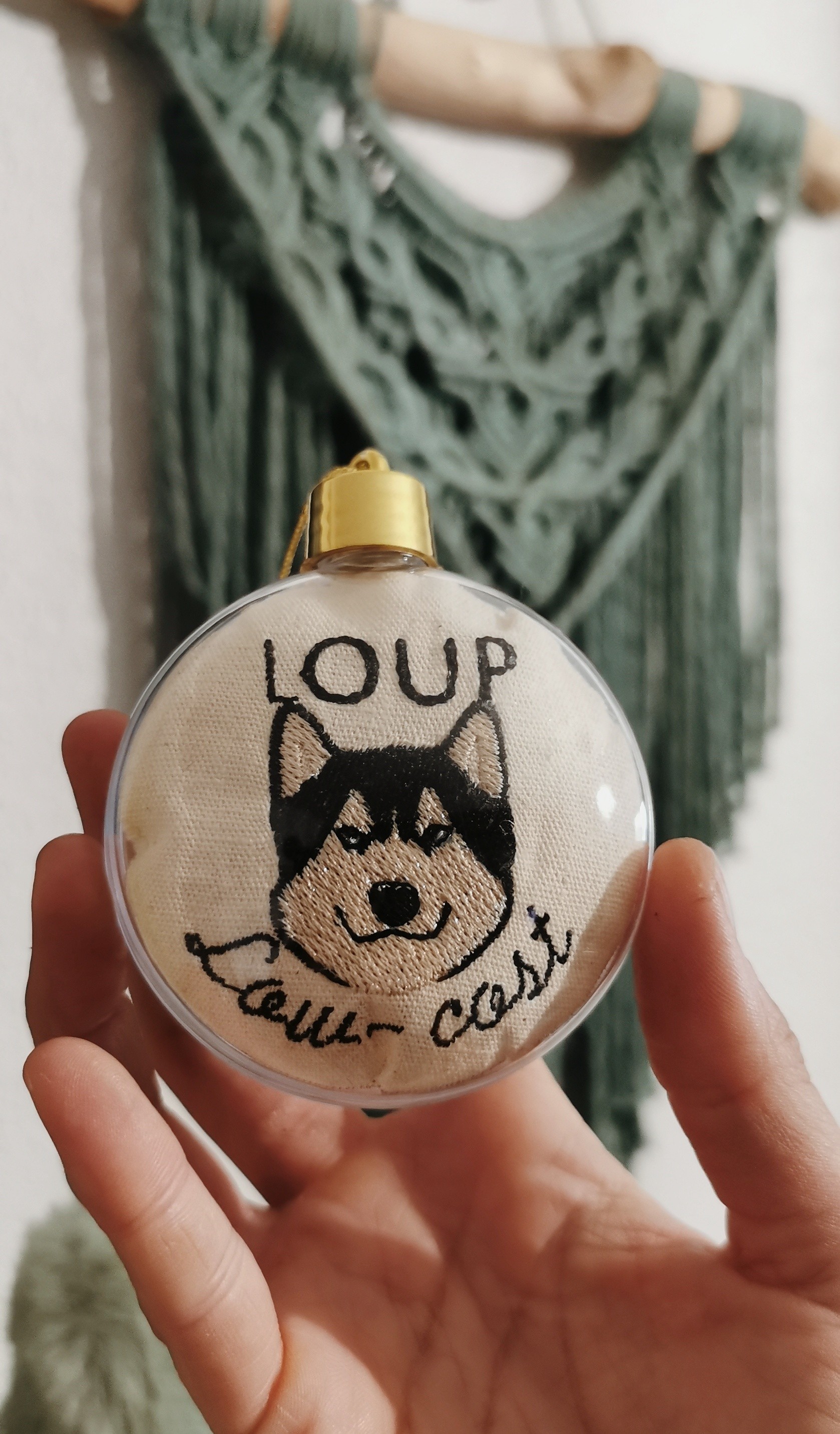 la boule humoristique Loup low-coast réalisée à la main, renferme une petite broderie d'un husky sur tissu écru recyclé.